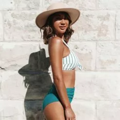 Women’s Teal Solid and Striped knotted Front High Waisted Bikini – Cupshe
