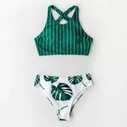 Women’s Teal Stripe and Leaves Print Bikini – Cupshe