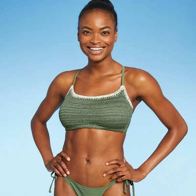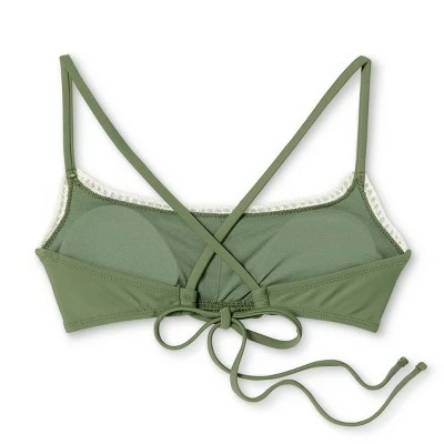 Keep your swimwear collection on-trend with the must-have look of this Crochet Bralette Bikini Top from Xhilaration™. It features a crochet texture for a sweet look, and sports a sage green color with white along the neckline. It’s perfect for pairing with brighter pieces or the matching bottoms for a complete, coordinated look. The back and neck ties meet in a crisscross for a cool, adjustable design, and you can further alter the fit to your liking with the removable cups. An opaque fabric construction offers you the confidence you need for a fun day relaxing on the beach or taking a dip in the pool.