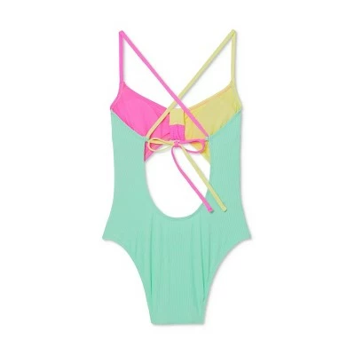 Add this Ribbed Colorblock Tie-Front One-Piece Swimsuit from Xhilaration™ to your swimwear collection for those days when you want to stand out from the crowd. The cheeky high-leg swimsuit is styled with an open front and back for a daring look, and the stretchy lightweight fabric and removable-cup construction add comfort. Plus, the colorblock fabric adds fun visual interest and the ribbed fabric adds a pop of texture. This tie-front one-piece swimsuit will turn your beach style up a notch, and can easily be paired with a swim cover-up or skirt for poolside lounging.