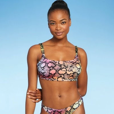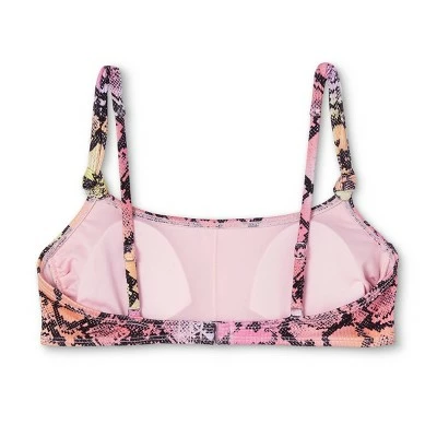 This Ribbed Knot Bralette Bikini Top from Xhilaration™ updates your swimwear collection with a fashion-forward look sure to impress friends at your next pool or beach party. It features a rainbow snakeskin print and knotted front straps for a cool, bold style. The back hook-and-loop closure lets you dress in and out of it with ease, and an opaque construction offers you the confidence you need for a fun, relaxing day in the sun. A ribbed design adds a touch of textured flair. Sport it with the matching bottoms for a chic, coordinated look you’re sure to love.