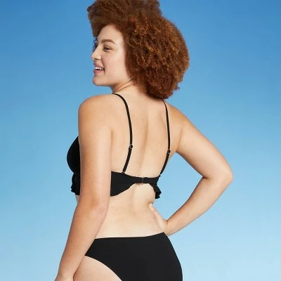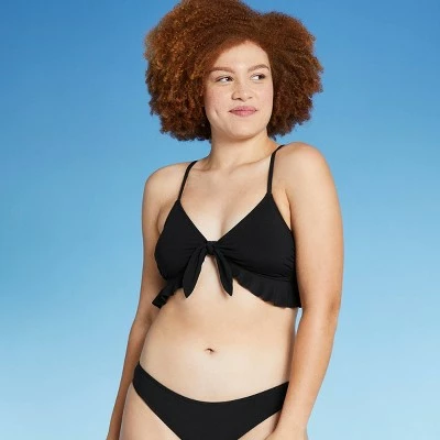 - Black ribbed bralette bikini top with ruffled frills and a tie-front detail
