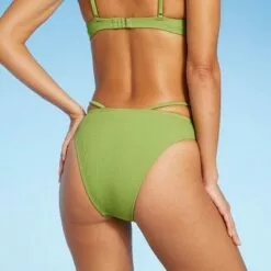 The Ribbed Strappy Extra Cheeky High-Leg Mid-Rise Bikini Bottom from Xhilaration™ is perfect for pool parties or a swim in the water. In a solid olive shade that’s easy to complement with a variety of swim tops and cover-ups for multiple styling options, this pull-on swim bottom is tailored in an extra cheeky cut with a high-leg, mid-rise silhouette for a playful look you’ll love. It’s adorned with allover ribbing and slender strappy accents on the waist for added interest. The ribbed swim bottom is crafted from a soft and lightweight fabric with added spandex to keep you nice and comfortable throughout your sunny adventures. It’s held in place by elastic at the leg openings, allowing you to move freely in and out of the water.