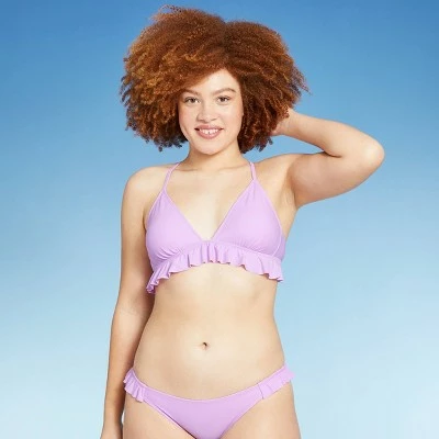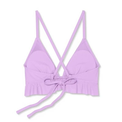 Soak up the sun in playful style in this Ruffle Triangle Bikini Top from Xhilaration™. The stretchy fabric allows for comfy movement and it’s designed with removable cups for customizable coverage. Plus, it features back ties to offer you a secure and personalized fit. Showcasing a playful triangle cut in a lavender hue with ruffles below the bust line and accented by a crisscross back, this solid bikini top is sure to bring the right amount of sassy style to your swimwear.