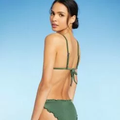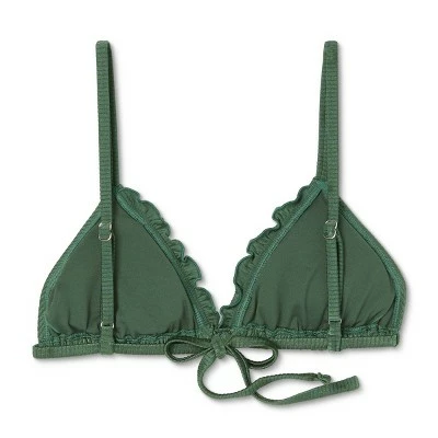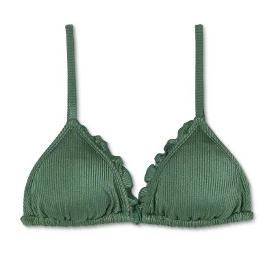 Freshen up your swimwear collection with this Ribbed Ruffle Triangle Bikini Top from Xhilaration™. It has a ribbed texture with ruffles in a sleek, moss green for a bold look you’ll love. The back tie provides an adjustable fit, and an opaque construction gives you the confidence you need as you’re basking in the sun or strolling along the shore. The cups of this top can be removed for your comfort. Pair it with matching or neutral-toned bottoms to rock a complete, coordinated look.