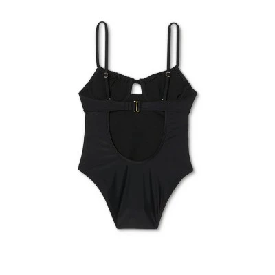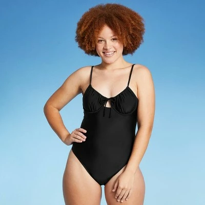 Take a lap around the pool or soak up some sun wearing the Shirred Underwire One-Piece Swimsuit from Xhilaration™ . In solid black, this sleeveless swimsuit adds an elegant addition to your swimwear collection and is made of a soft and stretchy material for easy movement with a flexible fit. You’ll love the sweetheart neckline on the front with string ties and a keyhole cutout, underwire design with shirring accents that offers enhanced support and shaping, as well as the removable soft cups that let you customize your look to suit your mood and style. The slender shoulder straps are adjustable to let you find your perfect fit for secure wear, and they lead into a scoop back featuring a back band with hook-and-loop closure for a stay-put fit.