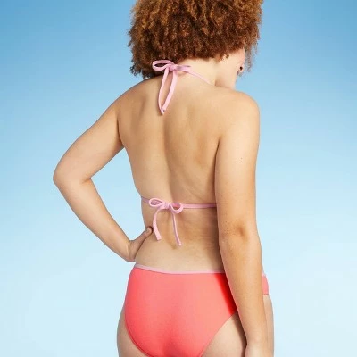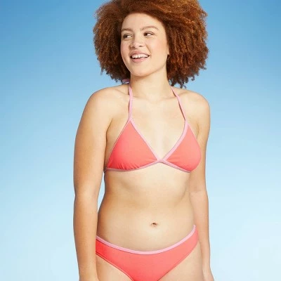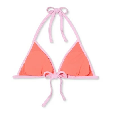 Lend your swimwear closet a trendy, fashion-forward update with this Contrast Binding Terry Triangle Bikini Top from Xhilaration™. It comes in three colors. One is a lavender purple, the others feature a salmon pink with a pale pink lining, and an ocean blue with a pale green outline. The contrast gives you a bright, bold look you’ll love showing off to friends at your next beach or pool party. Ties in the back and neck offer you an adjustable fit, and end in bows for sweet flair. The opaque construction lets you rock it in the full confidence you need to enjoy any day in the sun.