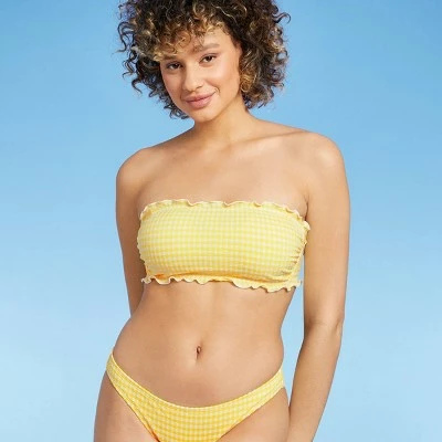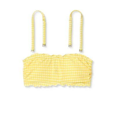 Update your swimwear with fun, fresh, up-to-the-minute style from this Textured Gingham Bandeau Bikini Top from Xhilaration™. The frilled edging and bright yellow gingham pattern gives this top a sweet, cheerful look that’s perfect for a day of relaxing at the beach or splashing around in the pool. The ties in the back provide you with an adjustable fit, and the opaque construction lets you enjoy the sun in full confidence. Pair it with matching or neutral-colored bottoms to sport a coordinated look that really pops.