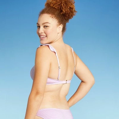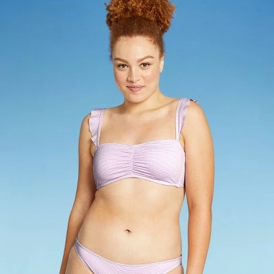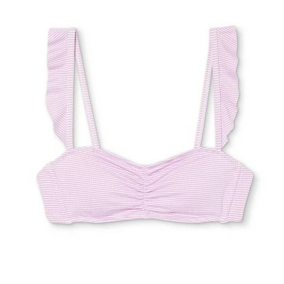 The Textured Stripe Ruffle Shoulder Bralette Bikini Top from Xhilaration™ is a vacay must-have. This cute bikini top comes in a classic bandeau style and features a textured stripe pattern, along with a cinched-front accent for an on-trend look. The fully adjustable tie-back fastening keeps the swim top in place, while ruffled shoulder straps with golden buckles provide a perfect fit every time. The textured stripe bikini top is made from a soft and stretchy fabric that offers you flexible movement whether you are swimming, lounging along the shore, and more. Wear it with matching bottoms and your fave beach accessories to finish the look.