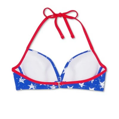 Walk down the beach or around the pool in patriotic style wearing this Underwire Bikini Top from Xhilaration™. Inspired by the American flag, this gorgeous bikini top features a blue backdrop printed with allover stars, red straps and an halter neckline for a form-flattering look you’ll love. The back neck tie and back hooks lend a hint of style while providing a secure, comfy fit. A touch of spandex provides effortless movement both in and out of the water, while the underwire lining with push-up design offers added support. This bikini top can be mixed and matched with a red-and-white striped bottom for a complete, coordinated look you’ll love showing off at your next pool party.