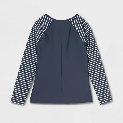 - Navy hue with white and navy striped sleeves coordinates with a variety of swim bottoms for chic styling
