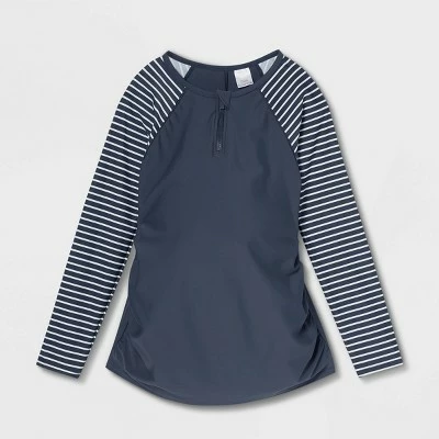 Functional and comfy, this Colorblock Long-Sleeve Rash Guard Maternity Top from Isabel Maternity by Ingrid & Isabel™ will become your favorite during your pregnancy days. This maternity rash guard is crafted from a soft fabric with added spandex for easy movement, and it’s designed with shirring at the sides to accommodate your growing belly. Featuring a long-sleeve design and offering you full torso coverage, it features a front quarter-length zipper with a fabric tab for easy wear. Adorned with navy and white striped raglan sleeves and an overall navy hue, this long-sleeve rash guard is sure to add chic style to your waterside hangs. Pair it with contrasting swim bottoms, a swim hat and shades for a beach-ready look.