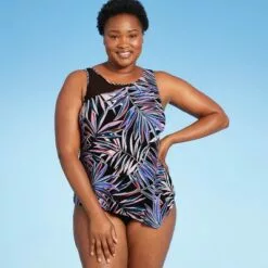 Women’s Asymmetrical Shoulder One Piece Swimsuit – Aqua Green® Black Multi