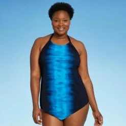 Women’s High Neck High Coverage One Piece Swimsuit – Kona Sol⢠Blue & White