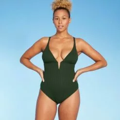 Women’s Ribbed Plunge Front V-Wire One Piece Swimsuit – Shade & Shoreâ„¢ Dark Green
