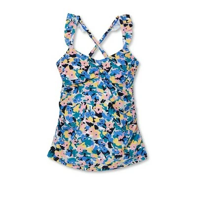 Enjoy any day by the water in the comfy-chic style of this Scoop Neck Ruffle Strap Maternity Tankini Top from Isabel Maternity by Ingrid & Isabel™. The tankini style provides full torso coverage, while a scoop neckline gives it a more interesting silhouette for added style. Sewn-in cups help to keep you covered at the bust, and adjustable straps that cross in back and ruched sides to accommodate your growing baby bump make it a piece you’ll feel great in with every wear. A ruffle along the straps adds a sweet touch of movement that’s perfectly complemented by the vibrant floral print, making it a swimwear piece you’ll love to show off.
