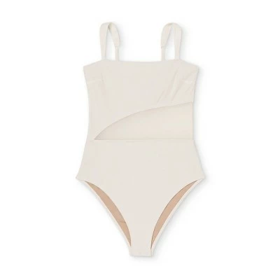 - One-piece asymmetrical swimsuit with mesh insert and high-cut legs for added flair and flattering fit