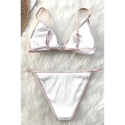 Get that sun kissed glow in our Bay of Angels Ribbed Triangle Crochet Bikini set! This super cute bikini set features triangle cups with removable padding and back hook closure. Detailed with contrast trim and backless design. Matching bottom is super flattering high cut leg with cheeky coverage.