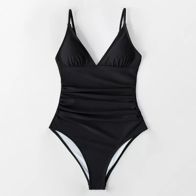 Bring the heat to your next beach getaway in our black ruched one piece swimsuit. This flattering one piece features thin straps and ruched detailing. Perfect to wear in and out of the water. Product Code: ASL0082BB
