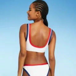 Americana dreams in Red, White, and Blue in this Contrast Sport Top from Sea Angel. This classic tank style is elevated with a rib textured fabric and contrast swim tricot for bright and bold pops of color. Features a V-front neckline and a scooped back. This style features removable cups for a customizable wear. It’s the perfect essential piece to showcase all things American. Pair it with your favorite coverups, over a pair of shorts or under a cozy hoodie.
