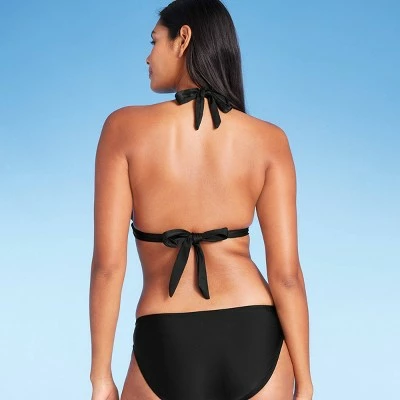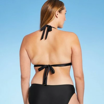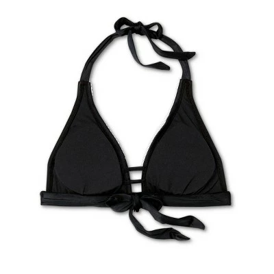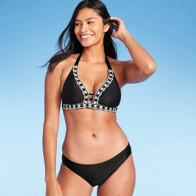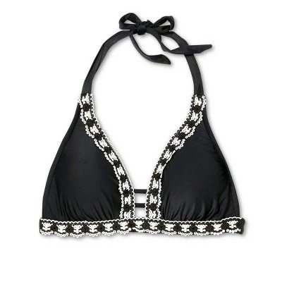Amp up a classic bikini top with cute crochet texture when you pair this Crochet Detail Bikini Top from Kona Sol™ with your go-to swim bottoms. Featuring a classic halter top design with tie neck and back closures for an endlessly adjustable fit, this stylish black bikini top also boasts removable cups for customizable coverage, and crochet trim around the top to add extra style and texture to the look. Two thin strappy accents hold the cups together in the front for a more stay-put fit, while the D/DD sizes feature an extra swan hook adjuster at the back closure for secure wear.