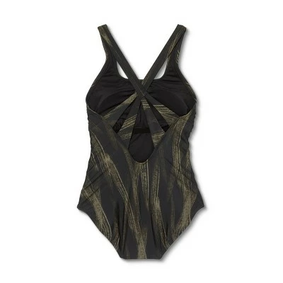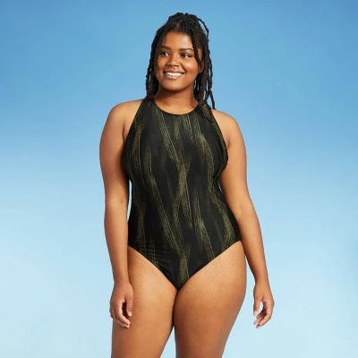 A one-piece design with a high neck lets you feel comfortable and confident on all of your beach days. The open back, crisscross straps and faded black-and-olive pattern add a sporty flair. Stretchy fabric and sewn-in cups allow freedom of movement and secure coverage, while a UPF 50+ rating helps you beat the heat whether you’re swimming in the ocean or playing a game of volleyball. Plus sizing features adjustable back straps, flattering back details and sewn-in cups.