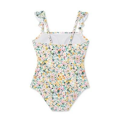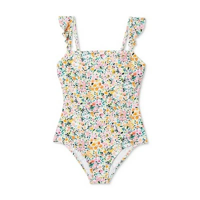 Sweeten up your swimwear collection with the blooming style of the Ditzy Ruffle Shoulder Medium Coverage One-Piece Swimsuit from Kona Sol™. A square neckline puts a fun spin on a classic one-piece silhouette and shows just a bit of skin while still keeping you covered, with sewn-in cups ensuring you stay covered at the bust. Ruffled straps add a playful touch, and an allover pattern of dainty flowers in orange, pink and yellow blossom against the white swimsuit for extra charm. The one-piece style and cute look make it easy to take this floral swimsuit from the water to the rest of the day’s outings just by slipping on a pair of black palazzo pants.
