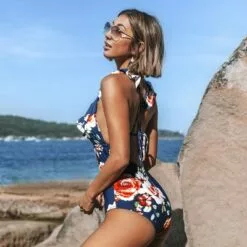 Embrace your free spirit in the blue floral plunging neck one piece. Features crisscross design at back for added support. The ruffled neckline adds the design. The self tied detail fits every body type.Product Code: 321-140011L