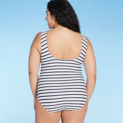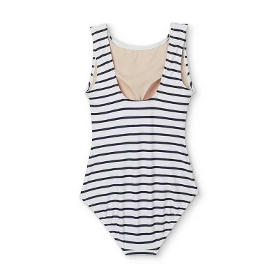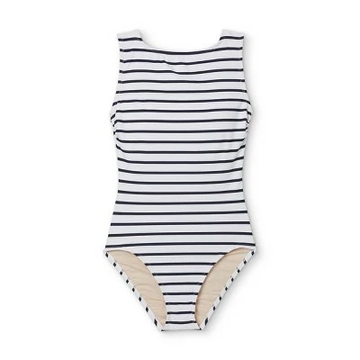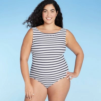 Whether you’re relaxing on the shore or spending a day on a boat, you’ll love the nautical style of the High-Neck High Coverage One-Piece Swimsuit from Kona Sol™. This one-piece swimsuit has a high coverage design that provides full torso and seat coverage, along with a high neckline and sewn-in cups to keep your bust fully covered. Horizontal navy and white stripes give the swimsuit a classic nautical aesthetic that can take from your aquatic escapades to the rest of the day’s outings with ease just by slipping on a pair of navy palazzo pants or bermuda shorts.