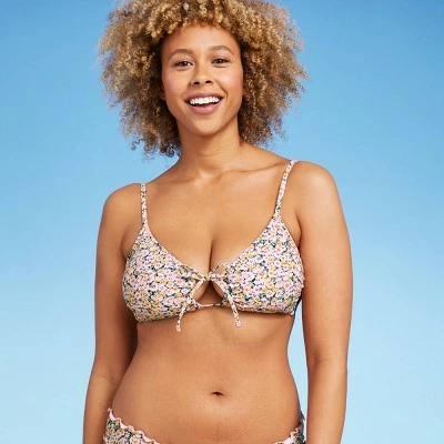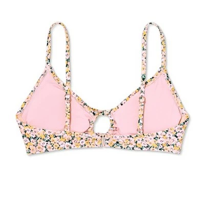Add floral charm to your poolside look with this Yellow Floral Keyhole Bralette Bikini Top from Shade & Shore™. This floral print bralette bikini top makes a charming pick in your swimwear. Made from stretch material for flexible comfort, it features a front keyhole, along with tie detail for a chic look. The adjustable shoulder straps and a hook back closure ensure a worry-free fit, while the removable cups make it easy to customize your look to suit your style. Pair with a matching floral print bikini bottom or a solid-color bikini bottom for an endless array of styling options.