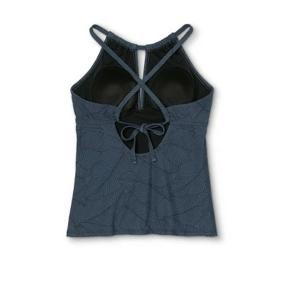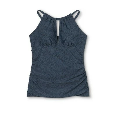 The Keyhole High Neck Tankini Top from Kona Sol™ is a swimwear piece you’ll love slipping on again and again when you can’t decide between a one-piece and a bikini. Full torso coverage makes this tankini a great pick when you want a two-piece option but don’t want to show as much skin as with a bikini, while the two-piece style feels less restrictive than a one-piece. The tankini has a high neckline and sewn-in cups for added bust coverage, with a keyhole at the neckline adding a little extra dimension. Shirring across the torso helps to create a chic, flattering silhouette that’s perfectly complemented by the gunmetal color and black palm frond pattern.