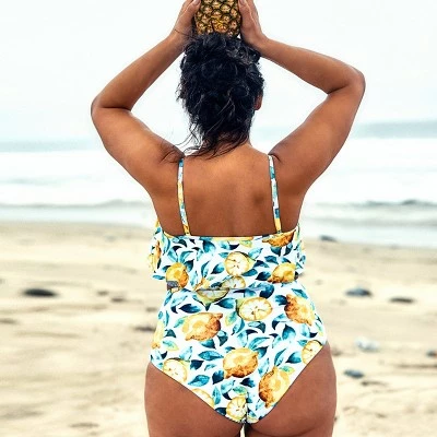 Add some fun for you beach time with this Leaf And Lemon Print Plus Size Bikini. This bikini features ruffles design with cute and fresh leaf and lemon print. Padded cups for light support and adjustable shoulder straps. The interlining is stripe print. Matching high waist bottom has the same lemon leaf print with moderate cheeky coverage that can be worn by both sides.