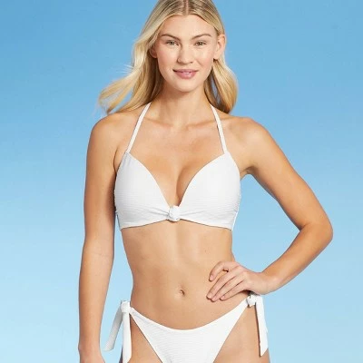 Add a simple twist to your beach-ready routine wearing this Light Lift Knot-Front Foil Ribbed Bikini Top from Shade & Shore™. Featuring a knot front, this white bikini top comes with an halter neck design for a chic, stylish look. It is made with soft fabric with added spandex for stretchy comfort and comes with an underwire for the right support and confident wear. Simply pair this white bikini top with a ribbed bikini bottom with knotted sides to head out to the beach or pool in sweet, coordinated style.