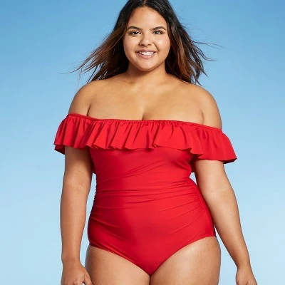 Spice up your swimwear with the Off-the-Shoulder High Coverage One-Piece Swimsuit from Kona Sol™. This one-piece swimsuit has a high coverage design that provides full torso and seat coverage, along with sewn-in cups for added bust coverage. An off-the-shoulder neckline puts a fun spin on a classic one-piece, and a ruffle along the neckline on both the front and back adds sweet detail. The whole piece pops in a vibrant shade of red, and the swimsuit includes a removable strap so you can opt to wear it as a bandeau swimsuit or as a halter swimsuit.