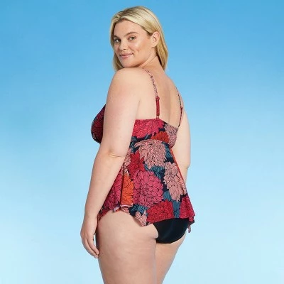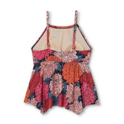 The High-Neck Flow Away Tankini Top from Kona Sol™ adds delightful dahlia flair to your swim look. This tankini top flares down from the cinched bustline and features a bold print of vibrant dahlia flowers and foliage against a navy background for a flowy look with easy-breezy flair. The pullover style boasts a high neckline front paired with slender and adjustable shoulder straps, as well as a sharkbite hemline that creates a beautiful asymmetrical look you’ll love. The printed swim top is made from a soft and stretchy fabric that offers you flexible movement whether you’re swimming, lounging along the shore and more. Wear it with black bikini bottoms or any solid color that complements the flowery tones.