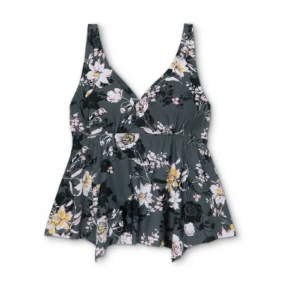 Give your swim look a floral finish with the Plunge V-Neck Strappy-Back Tankini Top from Kona Sol™. This tankini top flares down from the cinched bustline and features a vibrant floral print against a gray background for a flowy look with easy-breezy flair. The pullover style boasts a plunging V-neckline front paired with a ladder-back design and adjustable shoulder straps, as well as a sharkbite hemline that creates a beautiful asymmetrical look you’ll love. The printed swim top is made from a soft and stretchy fabric that offers you flexible movement whether you’re swimming, lounging along the shore and more. Wear it with black bikini bottoms or any solid color that complements the flowery tones.