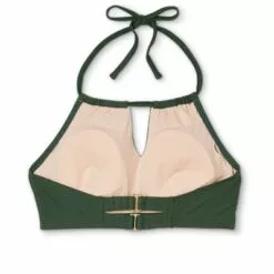 You’ll take to the water looking and feeling great in the Post-Mastectomy High Neck Keyhole Bikini Top from Kona Sol™. This post-mastectomy bikini top has a chic high neckline with a keyhole cutout for striking style, with a rich olive color adding to the sophisticated look. The swim top has large cup pocket openings for easy insertion of one or two prosthetics, and shirring across the front helps to hide any lines created by prosthetics. The high neckline and higher-cut armholes are positioned to help cover scars, and double swan-hook closures hold the top securely in place.