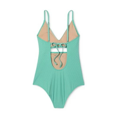 Amp up your vacay look with the Ribbed Plunge Cut-Out Sash-Tie One-Piece Swimsuit from Shade & Shore™. Made from a soft and stretchy fabric, this swimsuit for women is adorned with allover ribbing in a solid hue for a fun textural look. The pull-on swimsuit is fashioned with a plunging sweetheart neckline accented with a sash-tie detail below the bust, and a keyhole cutout to add peek-a-boo flair. The pull-on swimsuit has slender, adjustable shoulder straps and back ties that help you customize the fit for confident wear in and out of the water. Complete your look with a beach cover-up, oversized sunnies and espadrille sandals.
