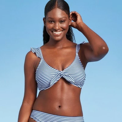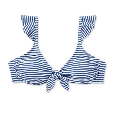 Splash in the waves in cool, breezy style by wearing this Ruffle Tie-Front Bikini Top from Kona Sol™. Covered with a white-and-blue stripe pattern, this sleeveless bikini top is adorned with ruffles along the shoulders and tie at the center of the bust for chic style. Made with a soft and stretchy fabric, this ruffle shoulder swimsuit offers flexible movement for comfy diving, playing at the beach or indulging in other fun activities. Pair this striped bikini top with a striped bikini bottom or a solid blue bottom to create a coordinating swim look.