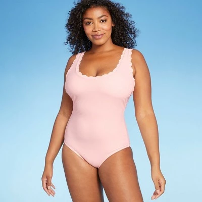 Add this Scallop Scoop Neck One-Piece Swimsuit from Kona Sol™ to your swimwear collection for those days when you want more comfort in movement and soft style at the beach. The crisscross-tie swimsuit is styled with scalloped edging for feminine flair, and the stretchy lightweight fabric and sewn-in-cup construction add comfort. This solid-hued suit offers full coverage and can easily be paired with a swim coverup or skirt for poolside lounging.