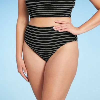 This Textured Pucker Mid-Rise Medium Coverage Bikini Bottom from Kona Sol™ adds a chic, retro-inspired look to your swim separates collection. This mid-rise bikini bottom features a simple pull-on fit for easy wear with a coordinating or contrasting bikini top of your choice. The mid-rise design offers comfortable coverage for confident wear and easy movement, while an allover pucker-textured fabric gives your look a cool and unique finish. A lined construction with spandex for stretch and elastic at the leg openings provides a comfortable fit that moves with you in and out of the water, and the basic black color adorned with allover skinny stripes is easy to mix and match with your go-to bikini tops.