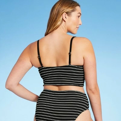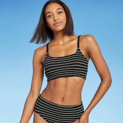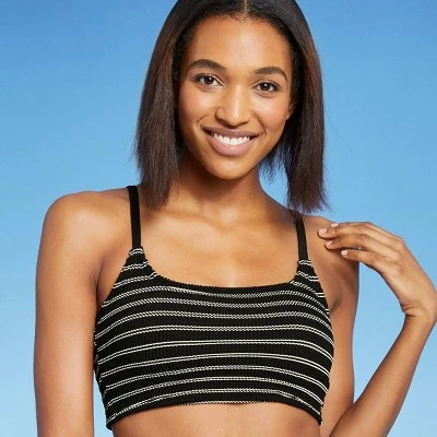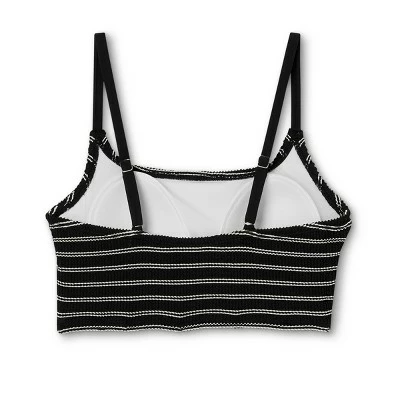 It’s easy to style a great go-to swim look when you pair this Textured Pucker Straight-Neck Bikini Top from Kona Sol™ with a variety of swim bottoms in your wardrobe. Featuring an allover puckered texture for added interest and style, this longline bikini top is designed with sewn-in cups for comfortable coverage that moves with you as well as a flattering shape. The square neckline offers a simple yet stylish silhouette, while adjustable shoulder straps make it easy to find the right fit for you. Skinny stripes on the black background along with the unique textured fabric add a retro vibe to the look, making it a perfect pick for pairing with high-waisted swim bottoms.